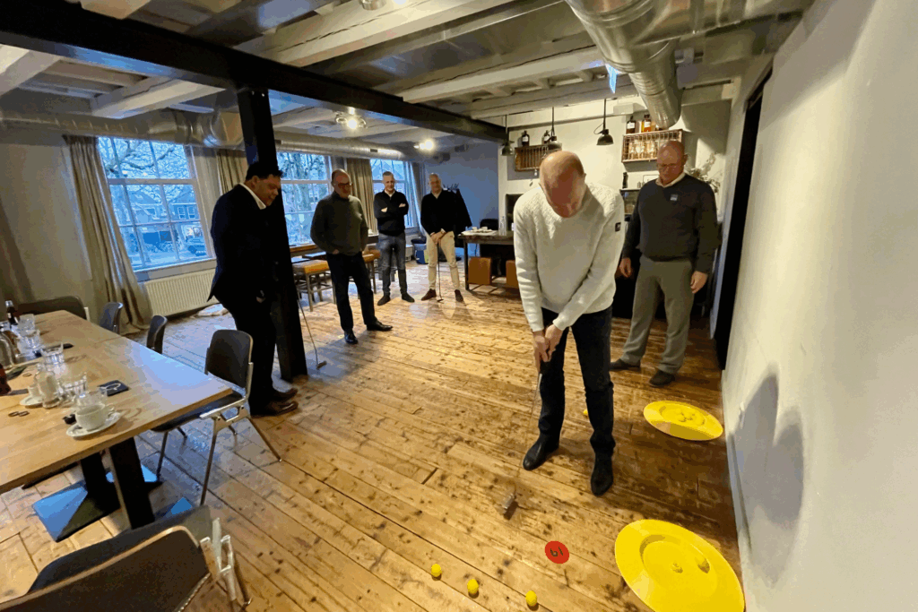 En zoals verwacht van een golfpro, testte hij ook de golfvaardigheden van onze partners met een competitieve puttingopdracht. Dit was een mooie afspiegeling van de dagelijkse uitdagingen en vaardigheden op de werkvloer. Afsluitend proostten wij op een succesvol 2024, vol groei, samenwerking en nieuwe uitdagingen!